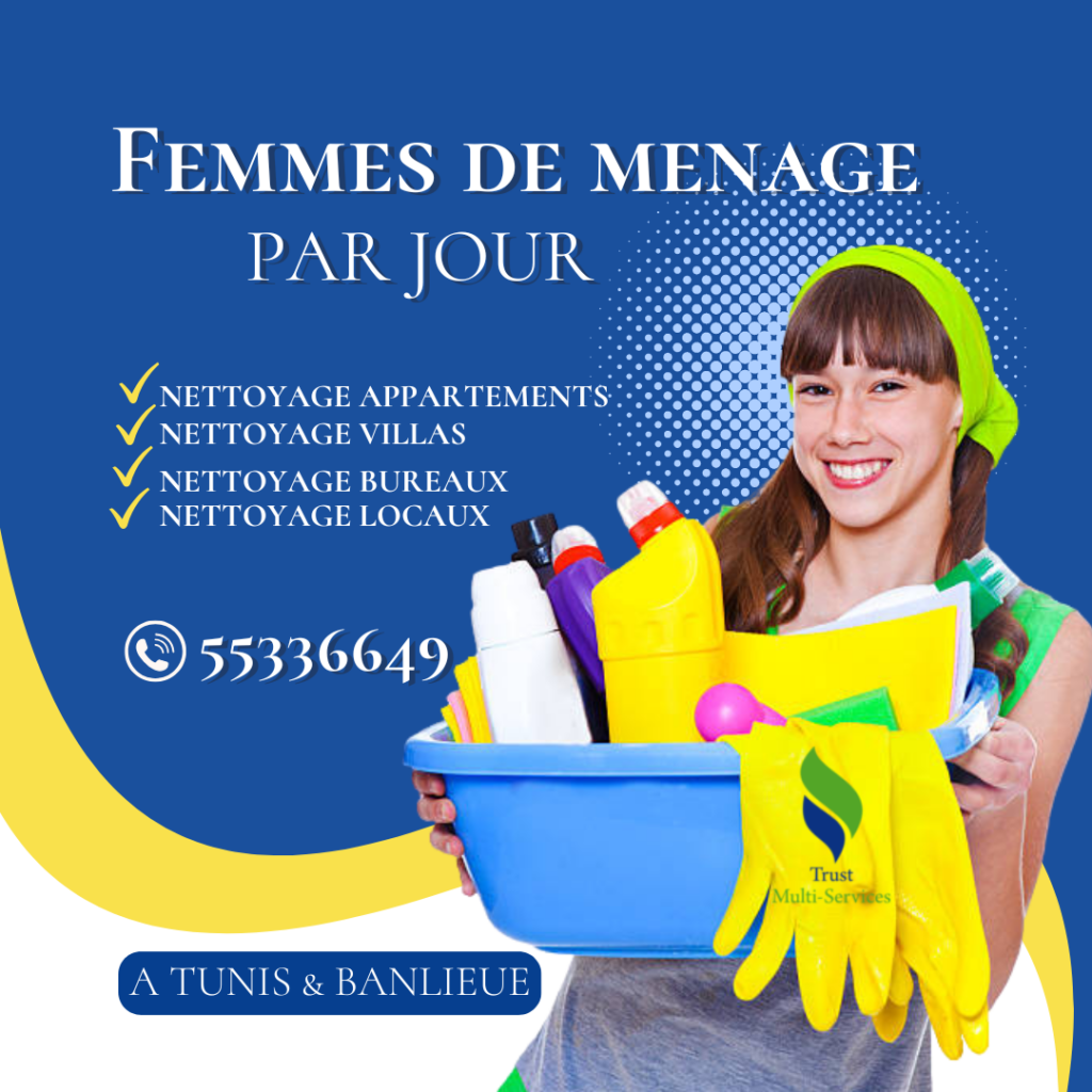 Nous mettons à votre disposition des femmes de ménage expérimentées pour le nettoyage de votre appartement, villa, bureau ou local commercial.