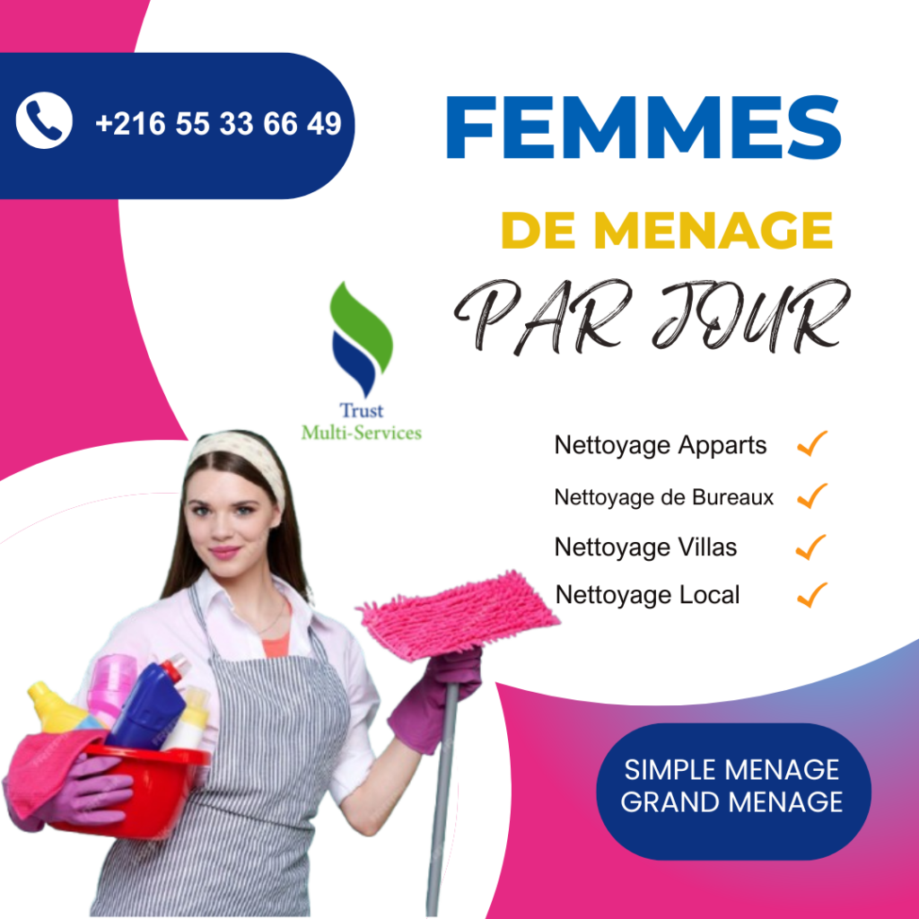 Nous mettons à votre disposition des femmes de ménage expérimentées pour le nettoyage de votre appartement, villa, bureau ou local commercial.