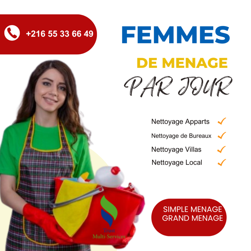 Nous mettons à votre disposition des femmes de ménage expérimentées pour le nettoyage de votre appartement, villa, bureau ou local commercial.