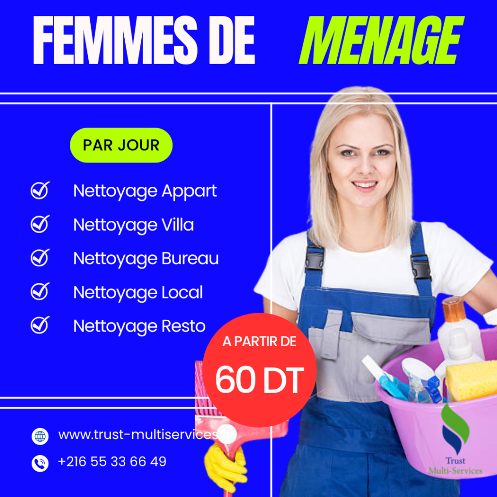 Nous mettons à votre disposition des femmes de ménage expérimentées pour le nettoyage de votre appartement, villa, bureau ou local commercial.