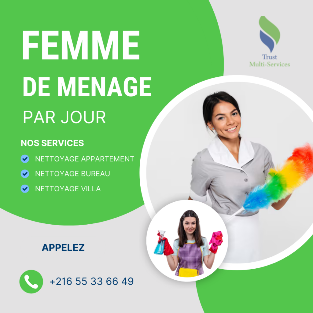 Nous mettons à votre disposition des femmes de ménage expérimentées pour le nettoyage de votre appartement, villa, bureau ou local commercial.